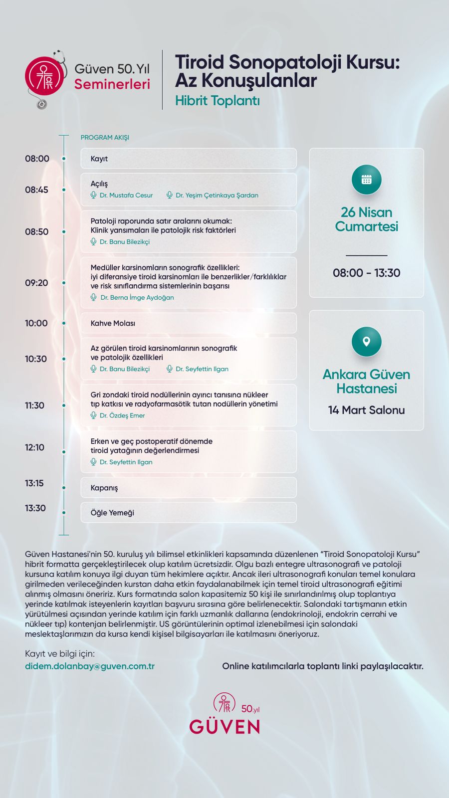 Tiroid kanseri tanı ve izleminde vazgeçilmez bir teknik haline gelen ultrasonografinin hasta yönetimine katkısı deneyim ile çok ilişkilidir. Ultrasonografiyi patoloji ile entegre ettiğimiz bu kursta sizler için Az Konuşulanları bol görselli olgu örnekleri eşliğinde patolojik ve klinik yansımaları ile birlikte tartışmayı hedefledik. Güven Hastanesinin 50. Kuruluş Yılı Bilimsel Etkinlikleri çerçevesinde düzenlenecek olan kursumuz hibrit formatta düzenlenecek olup salon kapasitemiz kurs düzeninde 50 kişi ile sınırlandırılmıştır. Yerinde katılım için başvuru sırasına göre kayıt alınacak olup on-line katılım için sayı kısıtlaması yoktur. Katılımın ücretsiz olacağı toplantımızda konuya ilgi duyan tüm hekimleri görmekten mutluluk duyacağız.